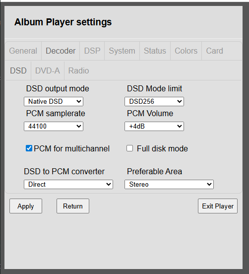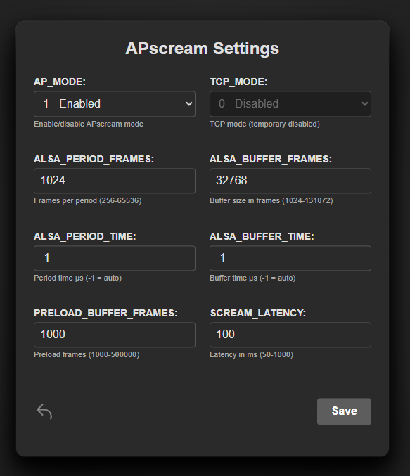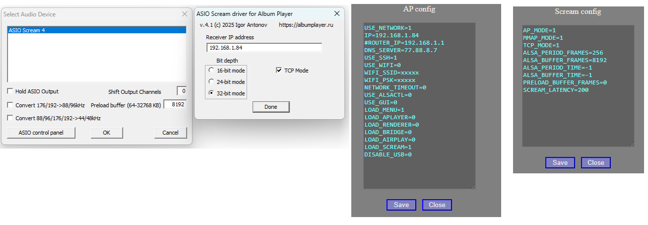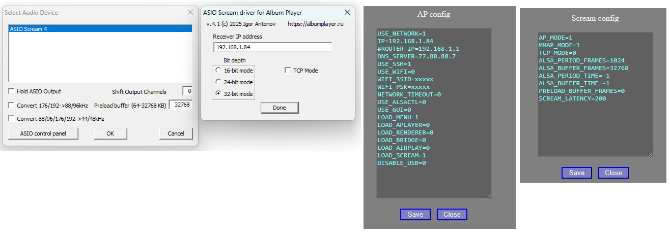 Большой Preload Buffer в ASIO избыточен. Редко когда для стабильности нужно более 256KB, да и тогда 2x-4x увеличение обычно достаточно. Проблема точно не с ним связана. На приёмнике, наоборот, Preload Buffer обнулён и ALSA Buffer в 4 раза уменьшен, а это может быть источником проблемы при медленной или нестабильной сети. Можно попробовать вернуть значение по умолчанию ALSA Buffer 32768, Preload Buffer 100000. Как-то ненормально, что с UDP не было звука вообще, пусть с помехами, но он должен быть. И напомню, что в Yoctoap устройство вывода для apscream выбирается в плеере или рендерере на вкладке Card.