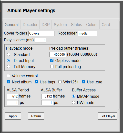Установил параметр PRELOAD_BUFFER_FRAMES=100000, задержки при старте воспроизведения, паузе и переходе на следующий трек, мне так не нравиться, обнулил.