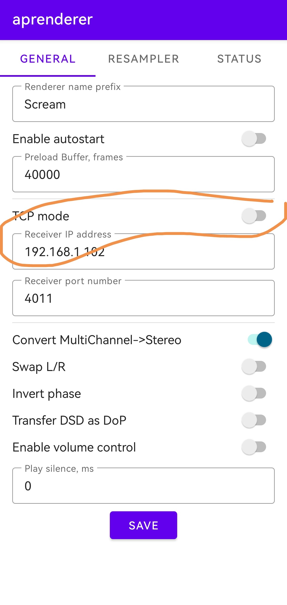 В ТСП прописал свой айпишник со стороны приложения, но звук не пошел, по UDP звук идет. Видимо нужно колдовать со стороны лисенка в настройках. И я так понимаю инструкции подробной для рендерера, этого нет или я просто не нашел?