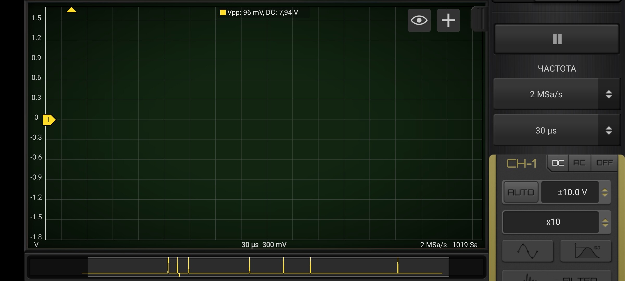 Включите AC, сейчас у вас включено DC, и потом поднимите чувствительность. Делитель1:1.