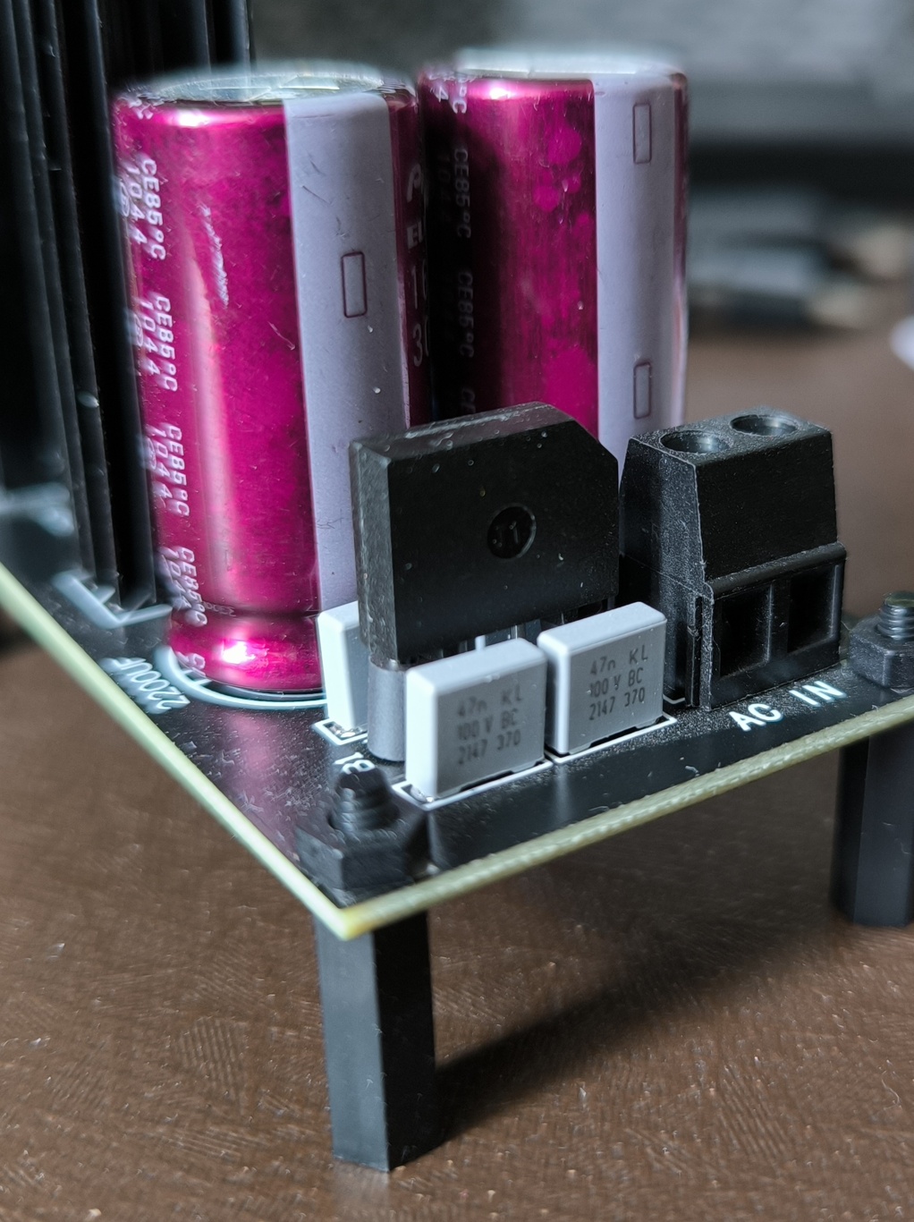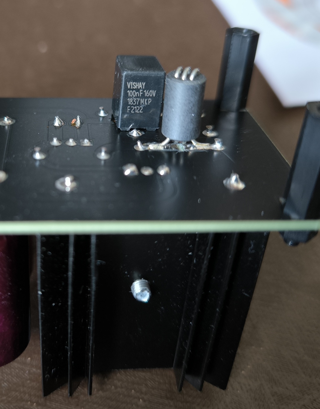 Откопал у себя такую же платку. Делал для себя, тоже хотел “как лучше”, пленка вишай, банки нарядные, мостик на бусинки ферритовые поставил (подсмотрел такое в минвеловском импульснике), катушку на выход тиснул. Радиатор покрупнее с термопастой не жалея. Можно вместо выходного клеммника ещё одну банку впаять и получится почти как у китайцев за десять тыщ рублей)))