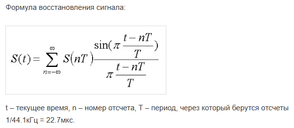 Считается доказанным, что любой стохастический (произвольный, случайной формы) сигнал, спектр которого выше определенной частоты равен нулю , может быть восстановлен по цифровым отсчетам, взятым через одинаковые промежутки времени, частота следования которых более чем в два раза должна превышать верхнюю частоту в спектре исходного сигнала. Для восстановления нужно каждый отсчет умножить на так называемый “Базис Котельникова”, который представляет собой некую интерполяционную функцию определенного вида.