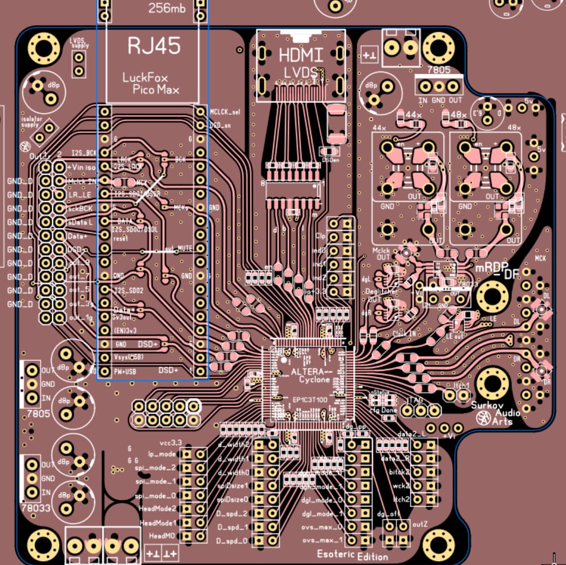 Развожу платку под кастомный ЦФ на ПЛИС с лисой, правда опыта толком нет, надеюсь на советы и конструктивную критику. Герберы и исходник будет доступен. Плата задумывалась как универсальная. Осталось питание ПЛИС на 1.5в доделать и так по мелочи. С LVDS разобраться, я так понимаю там все только в одну сторону работает? не получится мастерклок отправить наружу? может еще развязку добавить? Напомните, на какие пины добавить поддержку конденсаторами пока сделал SMD 6530(мм) на пины 40, 39, 36.