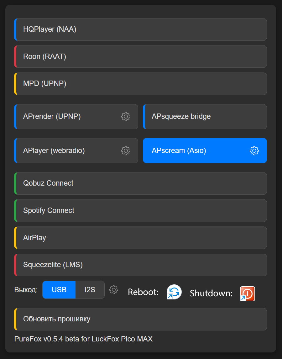 Если очень хочется перезагрузится, кнопка ребут есть в меню настройки I2S.
