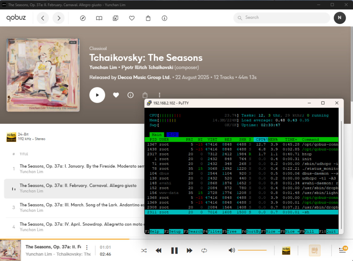 - Воспроизведение файла битрейтом 24-192 скачанного с Qobuz (файл лежит на сервере LMS (Daphile):