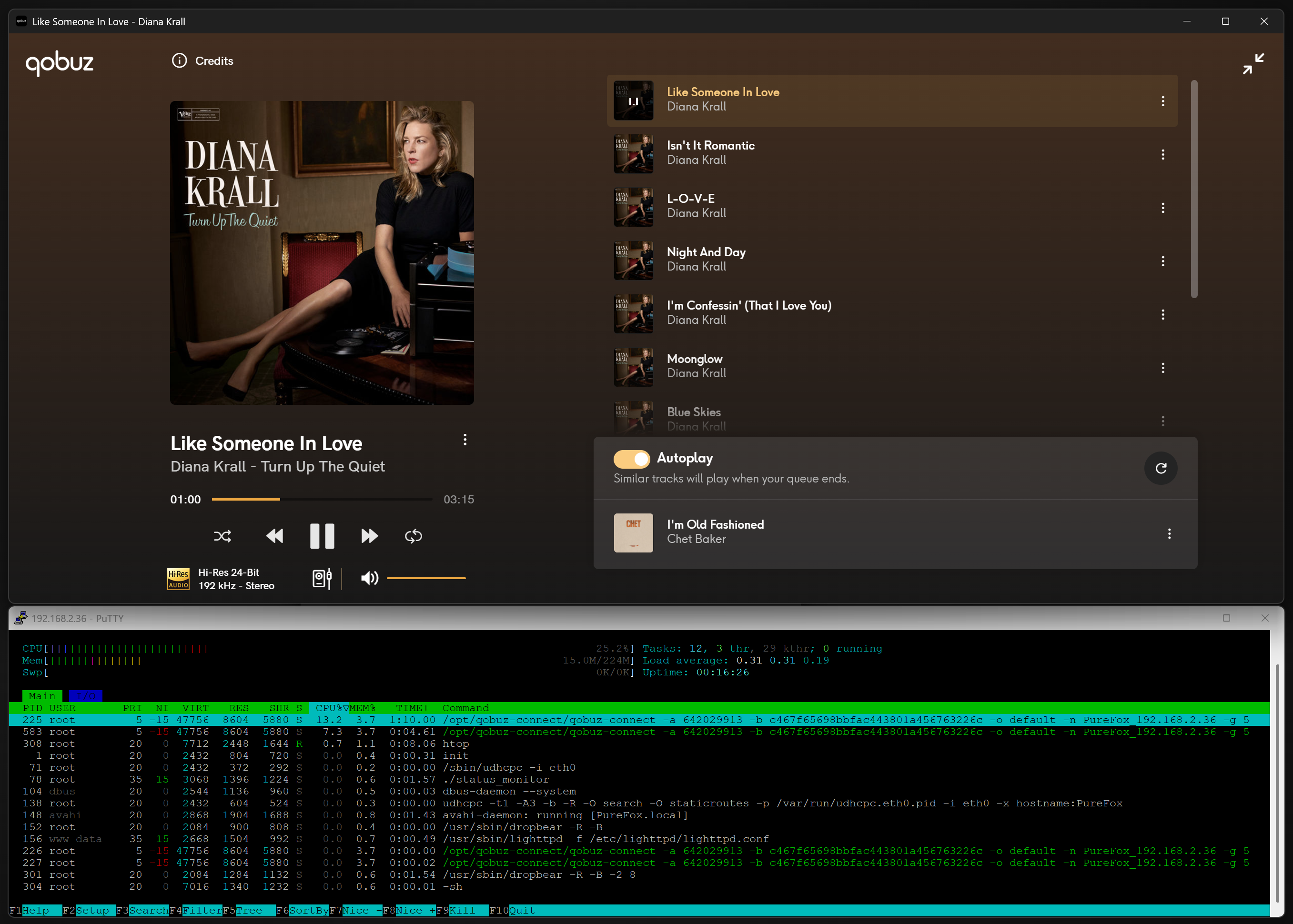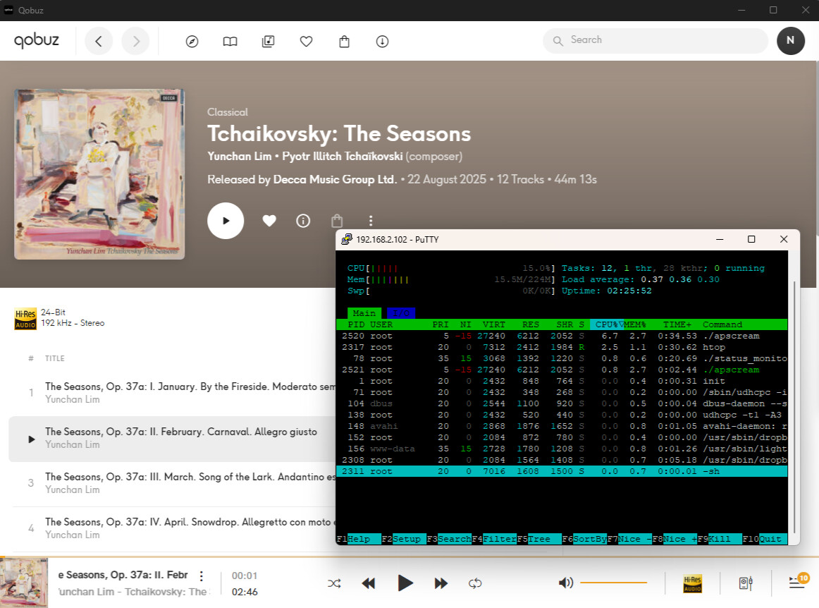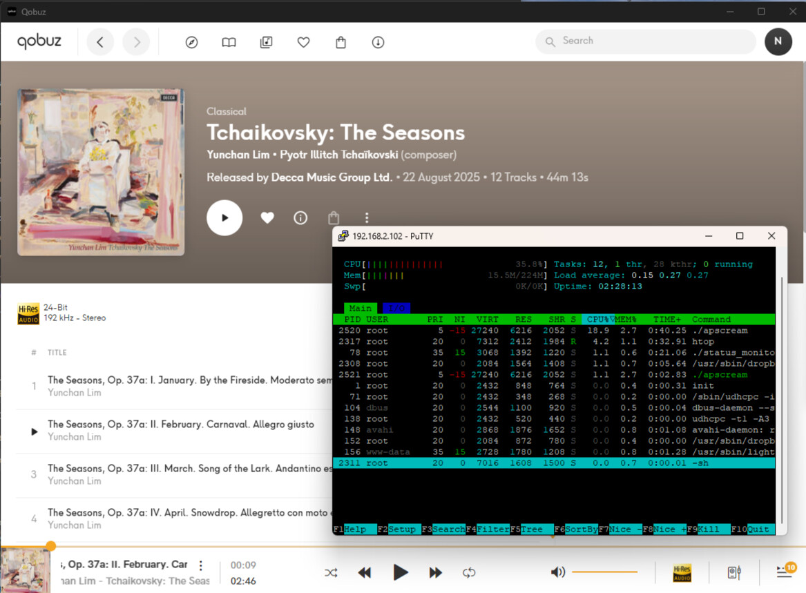 Воспроизведение из плеера Daphile на рендерер Сквизилайт. Играет без артефактов и остановок. Все норм. Загрузка процессора 25 - 35%