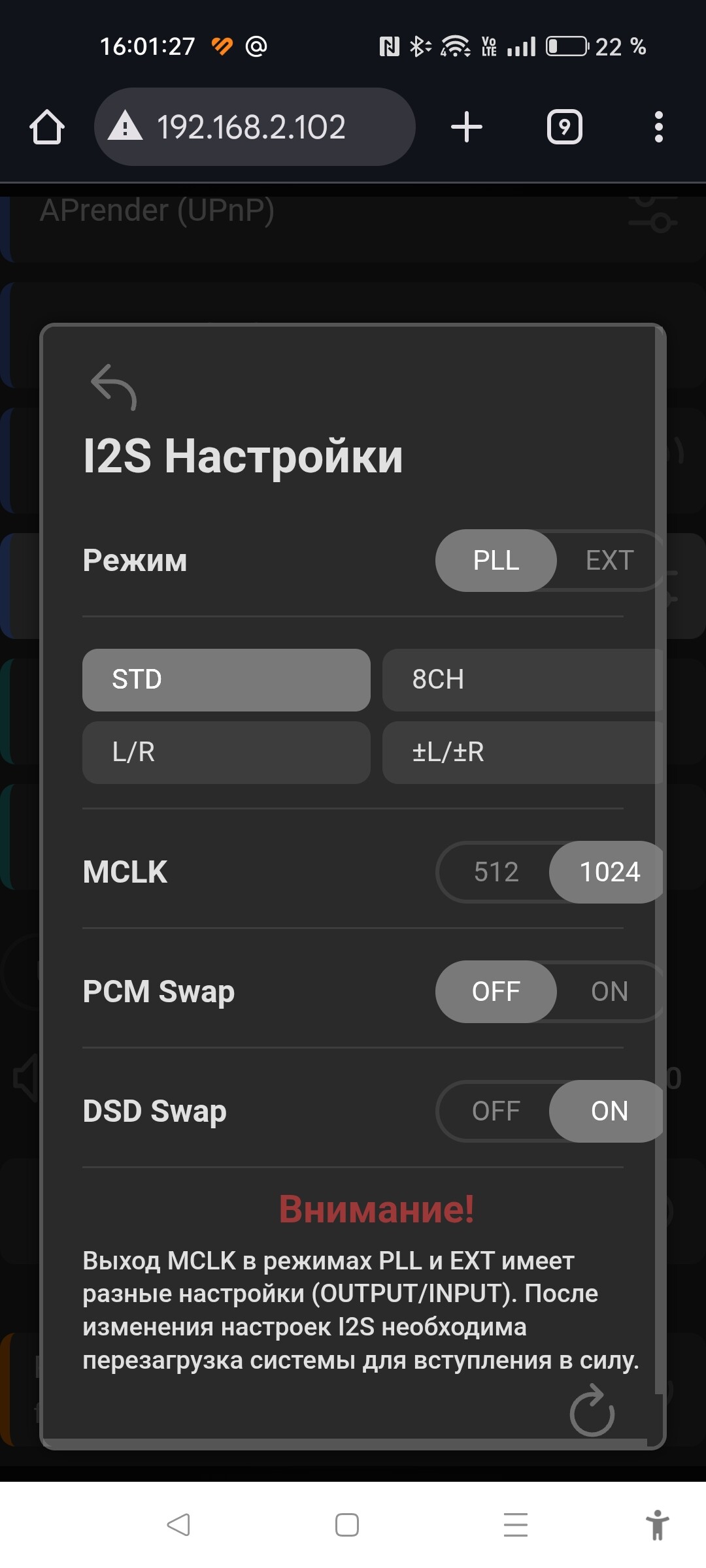 Кстати, ещё раз нажал обновить Лисёнка, после перезагрузки настройки i2s из ext сбросились на PLL. Снова настроил на внешние клоки, снова перегрузил. В локальной сети Нетиса оставил только двух Лисят и смартфон, остальные устройства выключил.