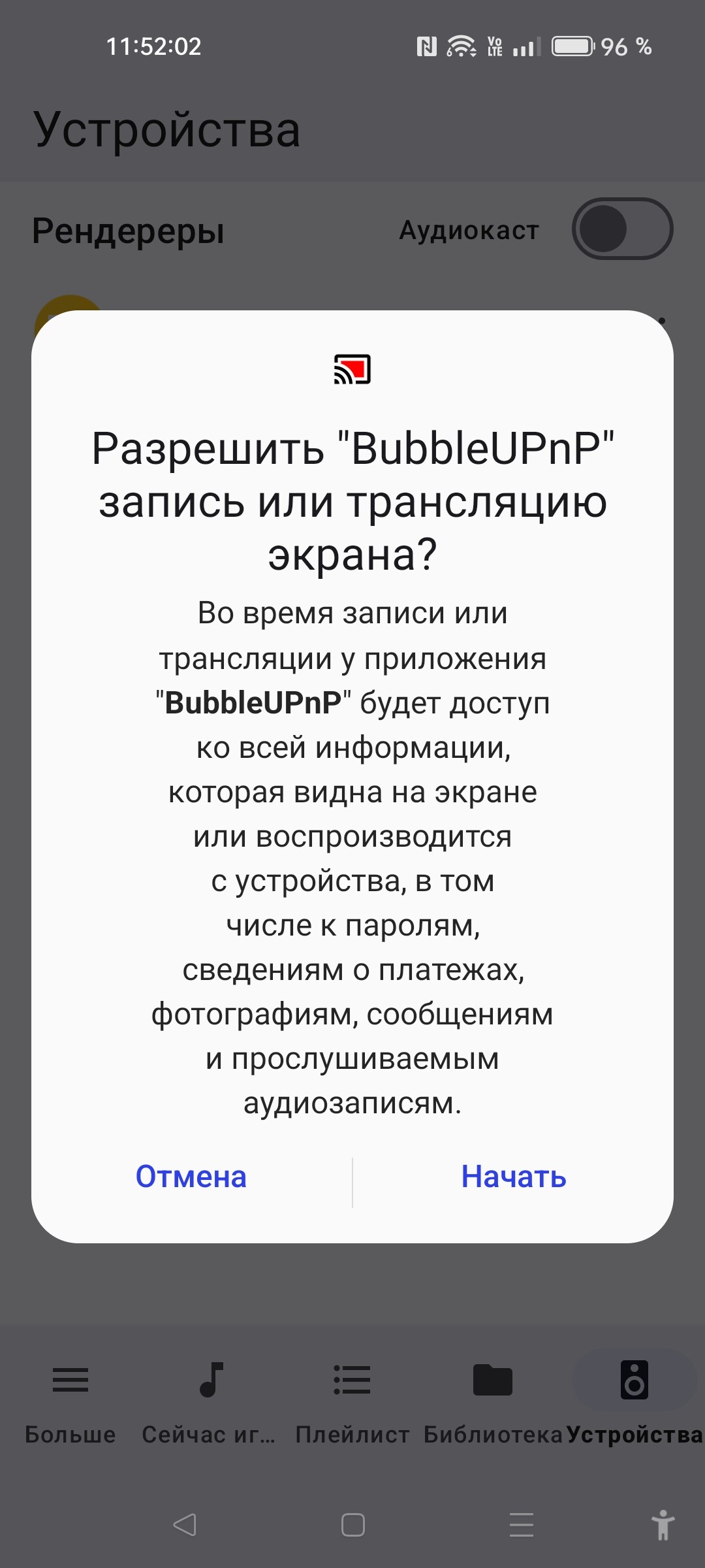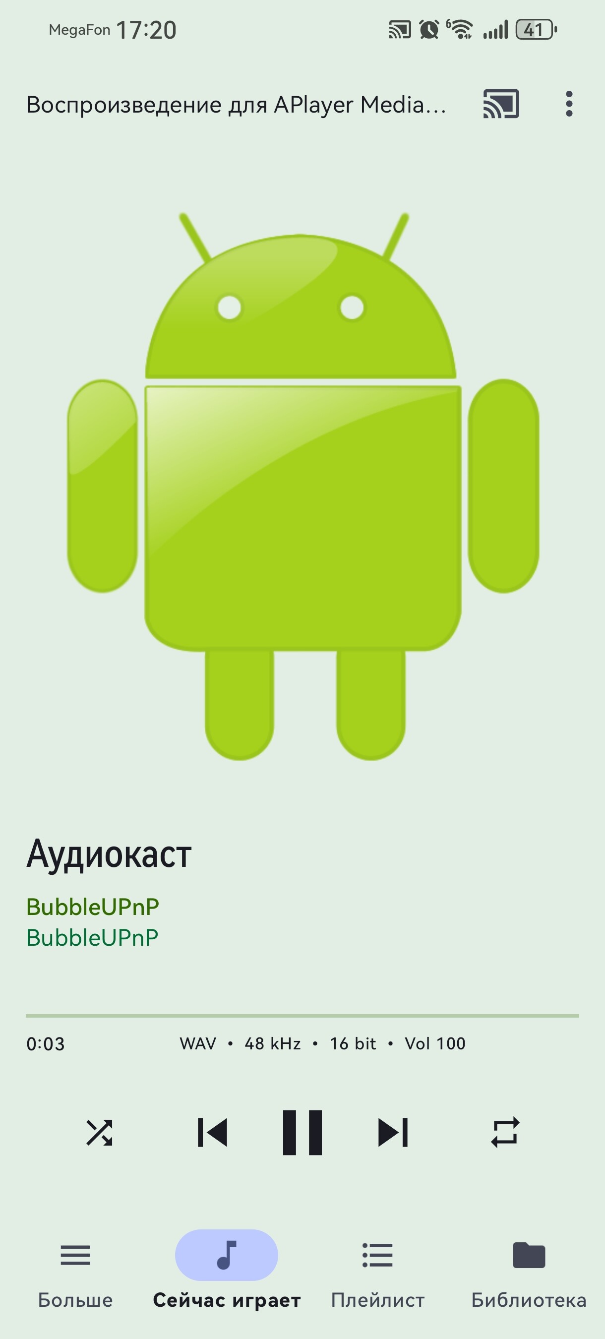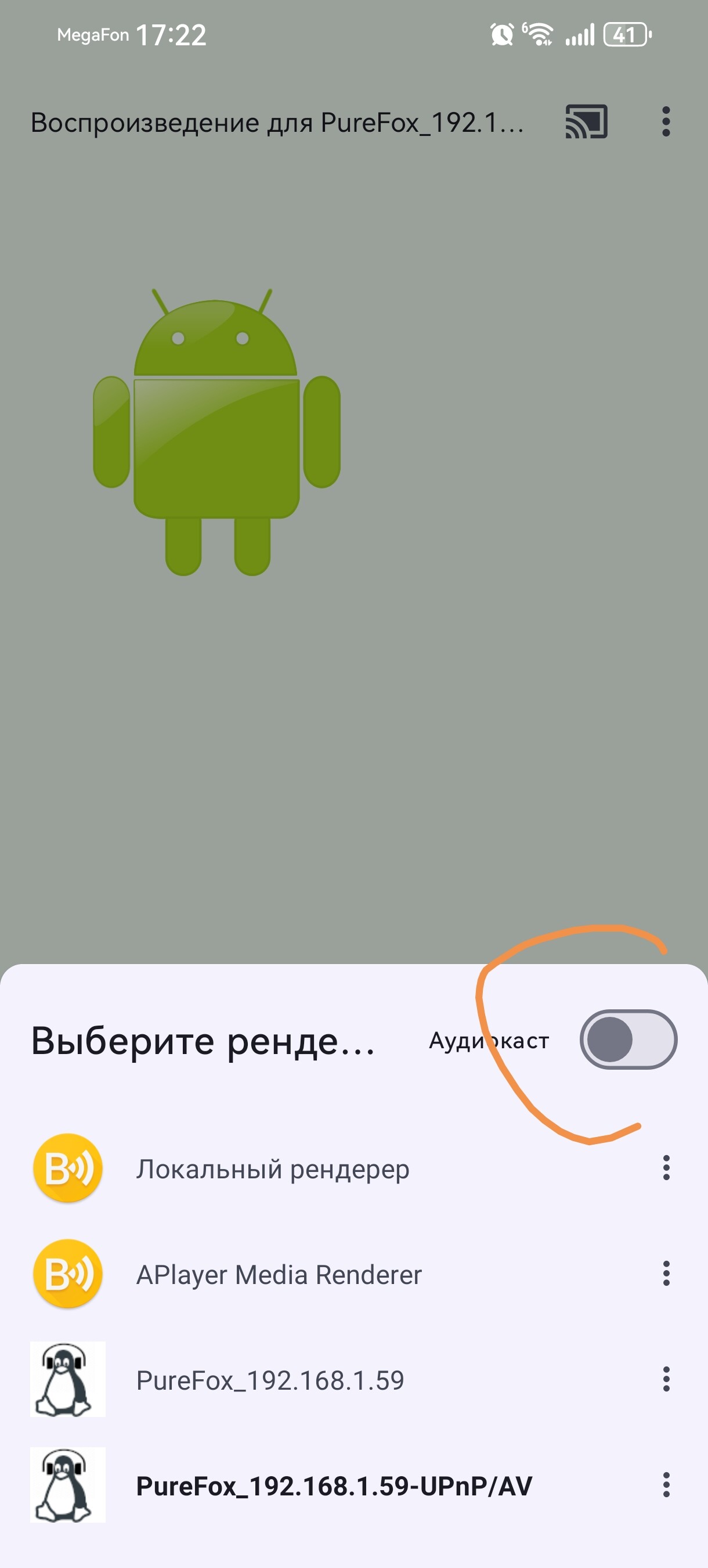 - В Bubble UPnP выбрал вывод на рендерер Aplayer, затем включил Аудиокаст