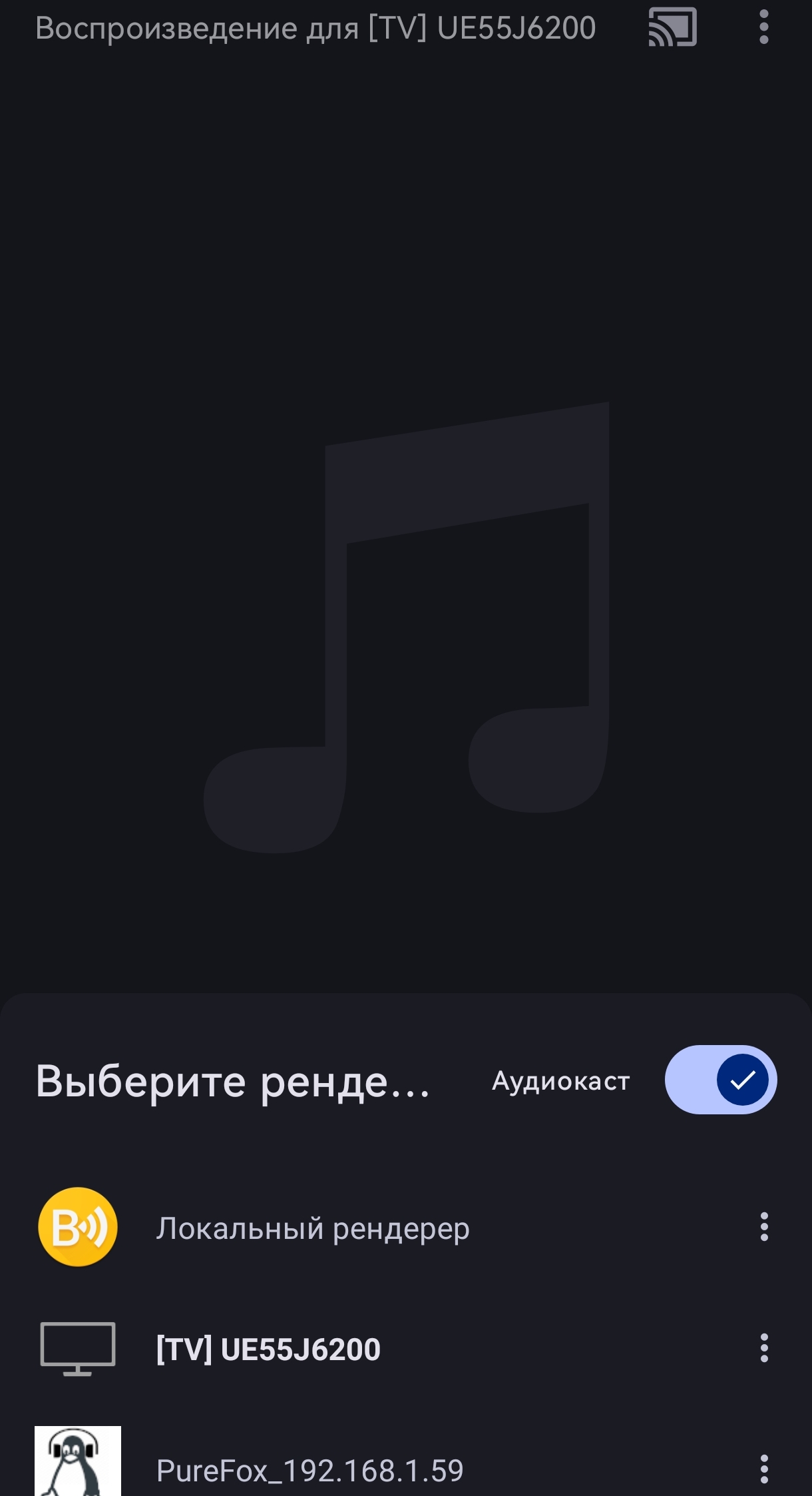 Вот смотрите, при попытке трансляции на телевизор при нажатии на кнопку аудиокаст телевизор запрашивает разрешение на подключени, и после подтверждения все. Начинает работать, на вот на лисенке в режиме mod нет.. Интересно, а вообще оно работает? С бабла и вима у меня не работает.