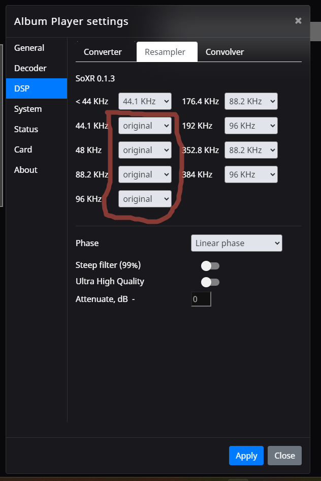 - Сначала я установил апсемплинг в максимальный для ЦАПа битрейт, после того как понял что что-то глючит вернул original (апсемплинг был включен в выделенных строках)