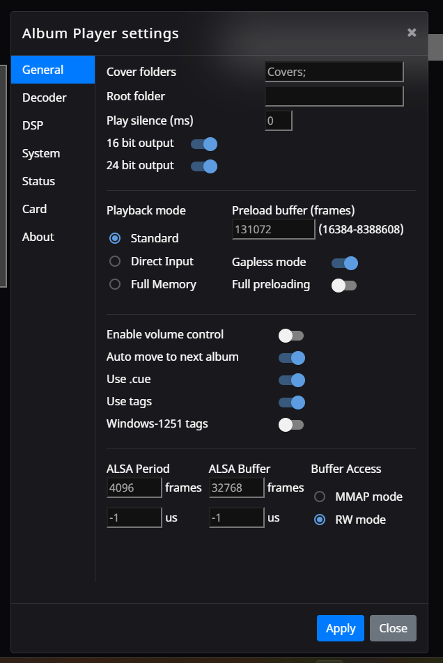 - Установил вот такие значения буфера, алса и buffer access сделал RW mode (вот тут не уверен что сделал правильно), но пока все играет нормально.