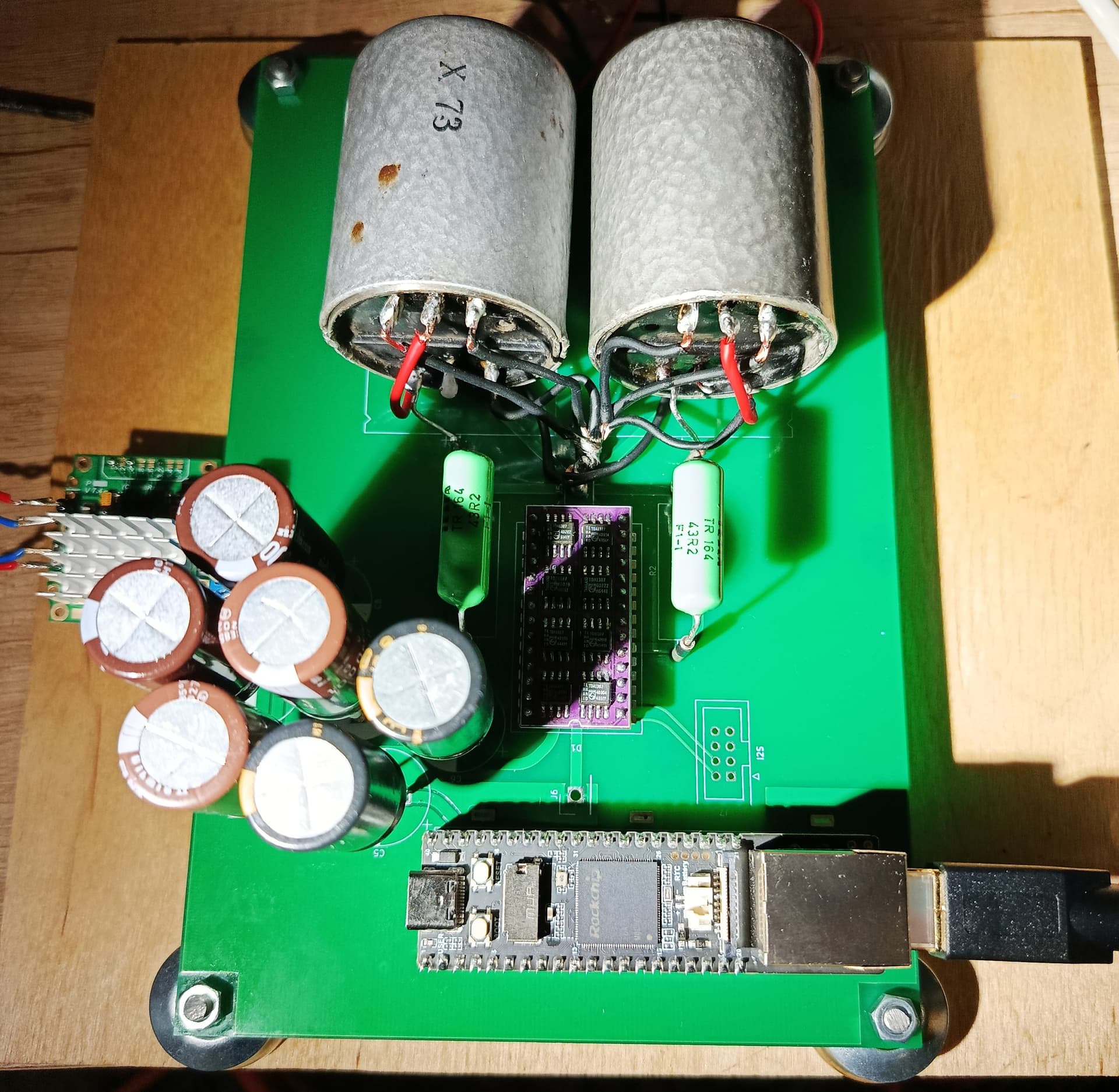 Вот так выполнено подключение по I2S. Тестовый вариант. Предполагались конденсаторы на выход, и сначала они и были, но попробовал с трансформаторами, что под рукой оказались, и кажется интереснее играет. Осталось дождаться обновления ПО, надеюсь проблемы с QC уйдут.