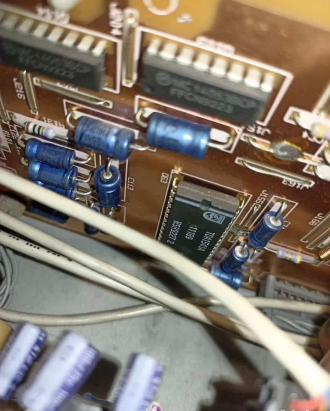 вот эти синие филлипсовские коаксиальные конденсаторы дохнут поголовно со временем и подлежат тотальной замене.
