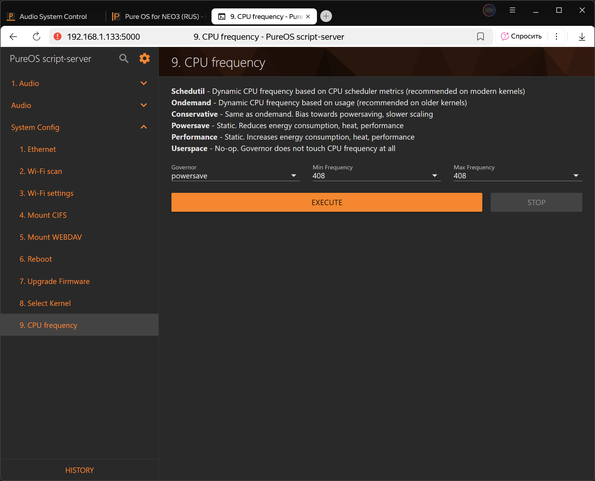 В Pure OS тоже все просто, но в режиме чистого endpoint (если не задействованы серверы и прочие надстройки) максимальная частота процессора не нужна, на самой низкой частоте переваривает самые тяжелые потоки не напрягаясь и не влияет на качество звука в худшую сторону.