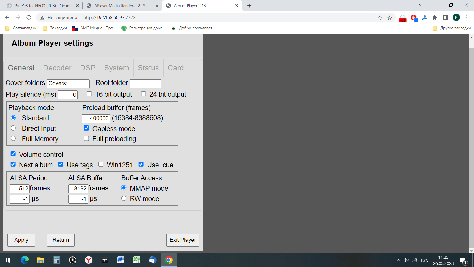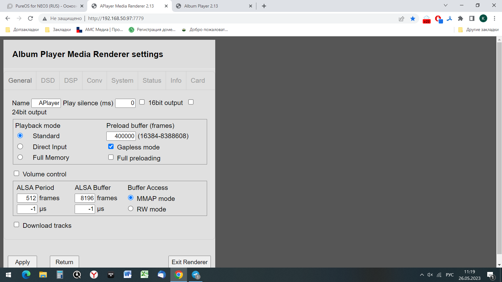 Про “настройки Аплеер рендерер умышленно убраны”, наверно, правильно. Как в MPD. Но то, как стоят настройки по умолчанию, могут не корректно работать (как у меня, например). Ладно, в MPD, все сразу и четко, но вновь купившие и не разобравшиеся (как я несколько недель назад) столкнутся с проблемой и будут озадачены, как попасть в эти настройки. Особенно после бигля, где это все было. Так что нюансы это все.