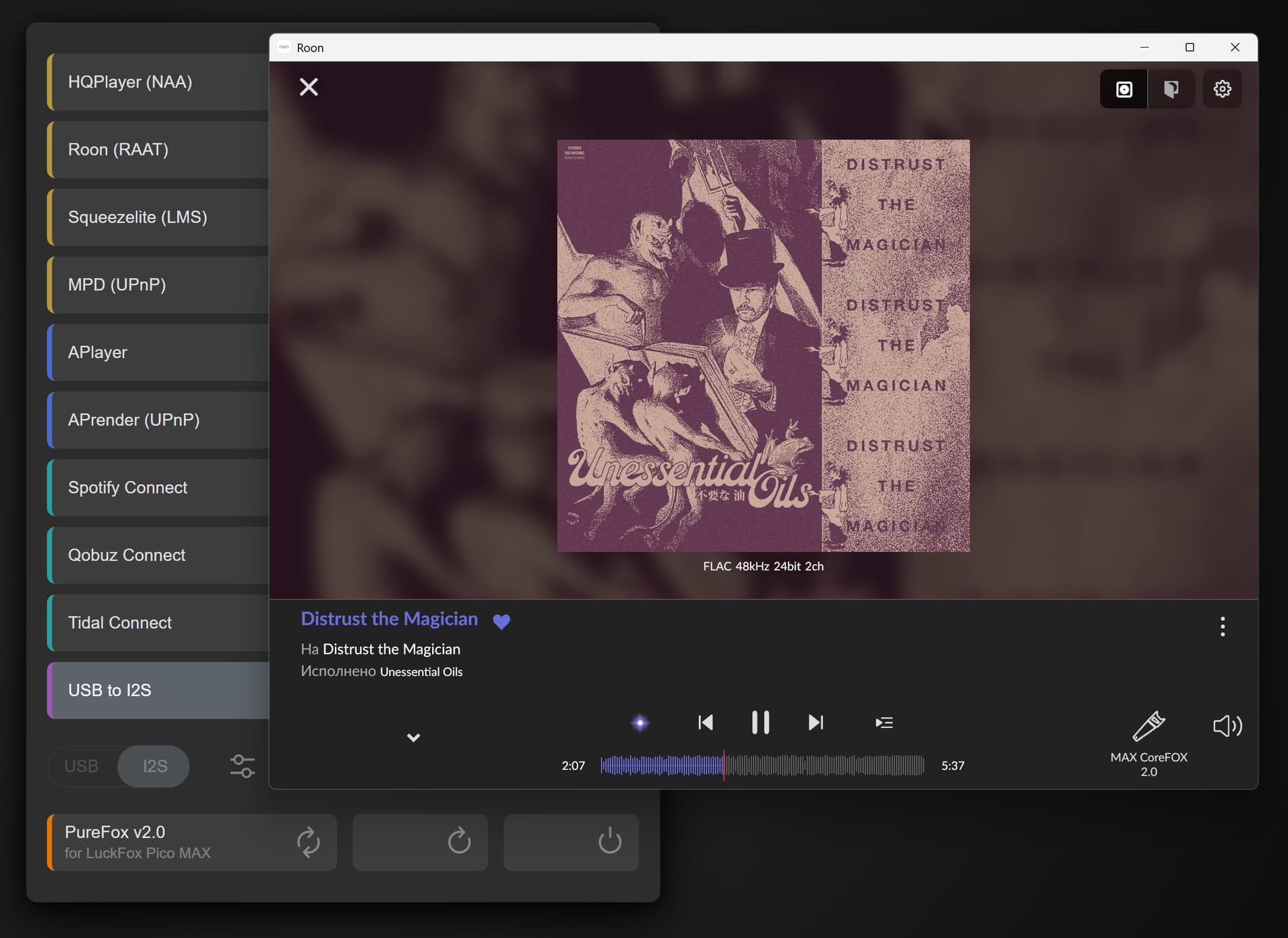 В фото лисьих сетапов есть конструкция, где основной транспорт USB->I2S (не лис, правда, но какая разница), а к нему по второму входу USB подключается лис.