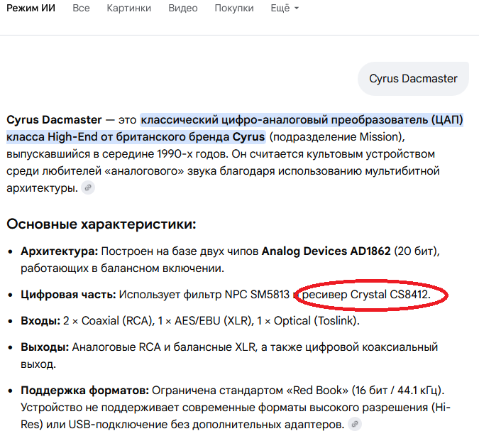Рустам, подглядел на другой площадке какой у Вас ЦАП. С учетом обведенного красным - можете не тратить время и деньги на переборы разных источников. Ресивер 8412 причешет все на свой лад (джиттер у него бешеный по нынешним меркам).