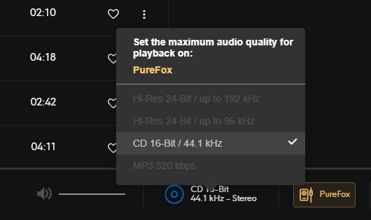 - Пропали опции хайреза в QC, есть только 16/44, хотя при переключении на другие устройства, включая телефон, хайрез играет, но при переключении на PureFox остается только опция 16/44. Проблема появилась на днях, ранее много месяцев сетап работал без нюансов.